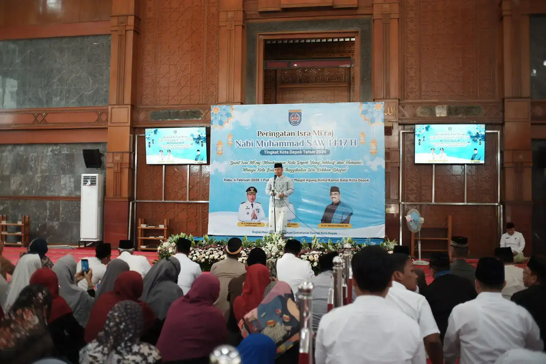 Wali Kota Depok, Supian Suri, menghadiri acara Peringatan Isra Mikraj Nabi Muhammad SAW 1447 H di Masjid Agung Baitul Kamal, Balai Kota Depok, Rabu (04/02/26).